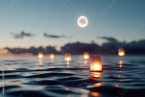 The watermark will not be included on Wall mural.: Serenity by the ocean under a full moon with drifting lanterns illuminating the waves