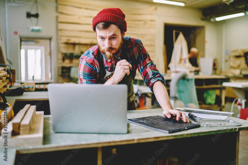Wall mural serious bearded male master checking information from website while creating sketch and plannings fo