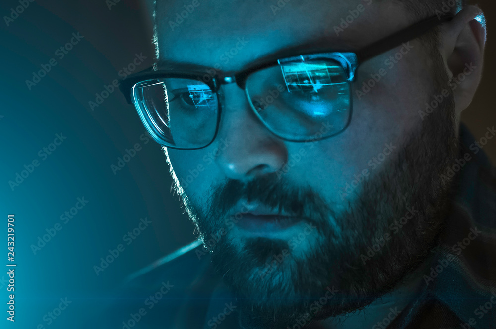 Wall mural : Serious man with reflection of laptop screen with website data in glasses working late, close up - in