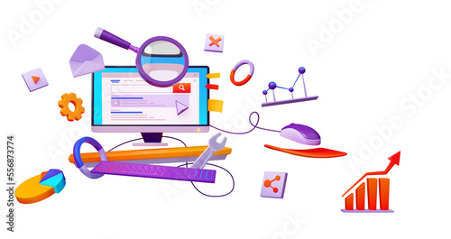 Wall mural serp, search engine result page concept with website on computer screen, magnifier, charts and graph - Wall murals Wall mural serp, search engine result page concept with website on computer screen, magnifier, charts and graph - Wall murals