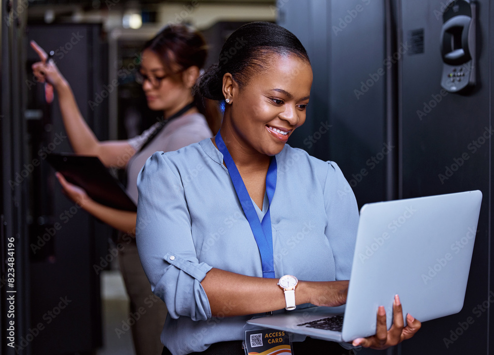 The watermark will not be included on Wall mural.: Server, technician and people programming maintenance on laptop with teamwork in it and engineering -