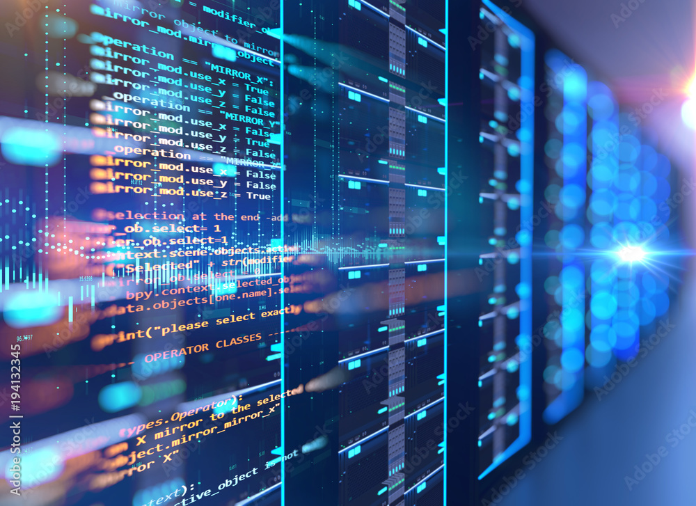 Wall mural server room 3d illustration with programming data design element. - Wall murals Wall mural server room 3d illustration with programming data design element. - Wall murals