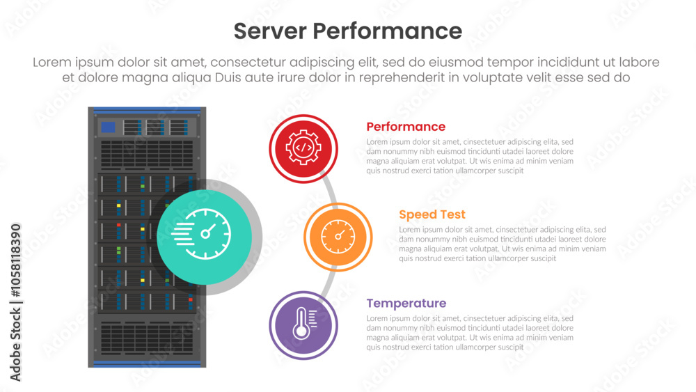 Wall mural : Server technology infographic template banner with standing server and half circle line connection f