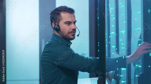 Wall mural service support technician inspecting open internet rack server working on laptop computer doing web