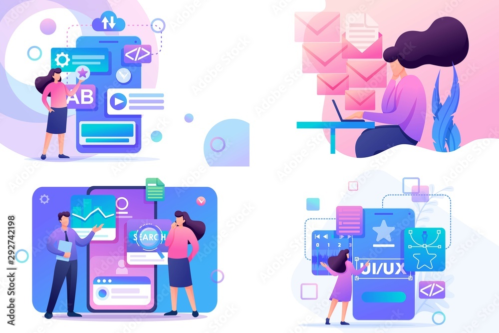 Set flat 2d concepts mobile app, ui ux design, super testing, send message - for concept for web desiWall mural