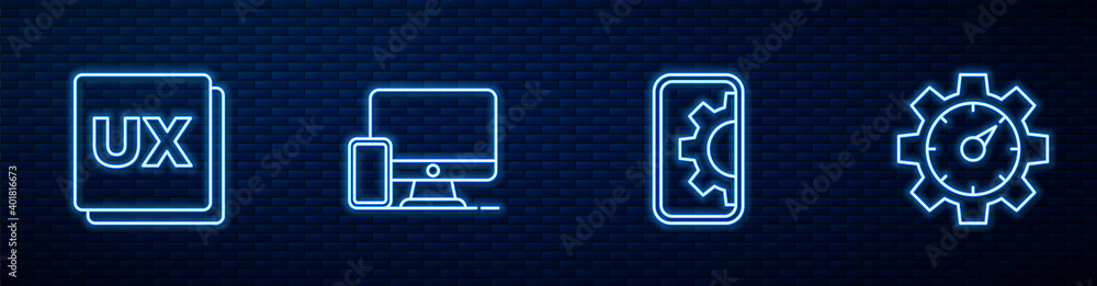 The watermark will not be included on Wall mural.: Set line web development, ui or ux design, monitor and mobile and website statistic - glowing neon ic