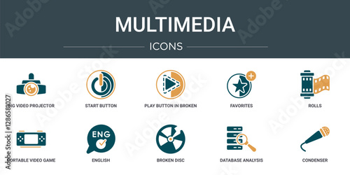The watermark will not be included on Wall mural.: Set of 10 outline web multimedia icons such as big video projector, start button, play button in bro