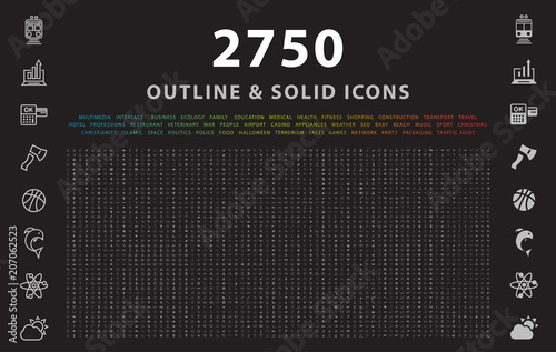 The watermark will not be included on Wall mural.: Set of 2750 outline and solid icons on black background - vector isolated elements