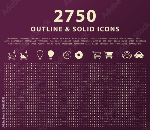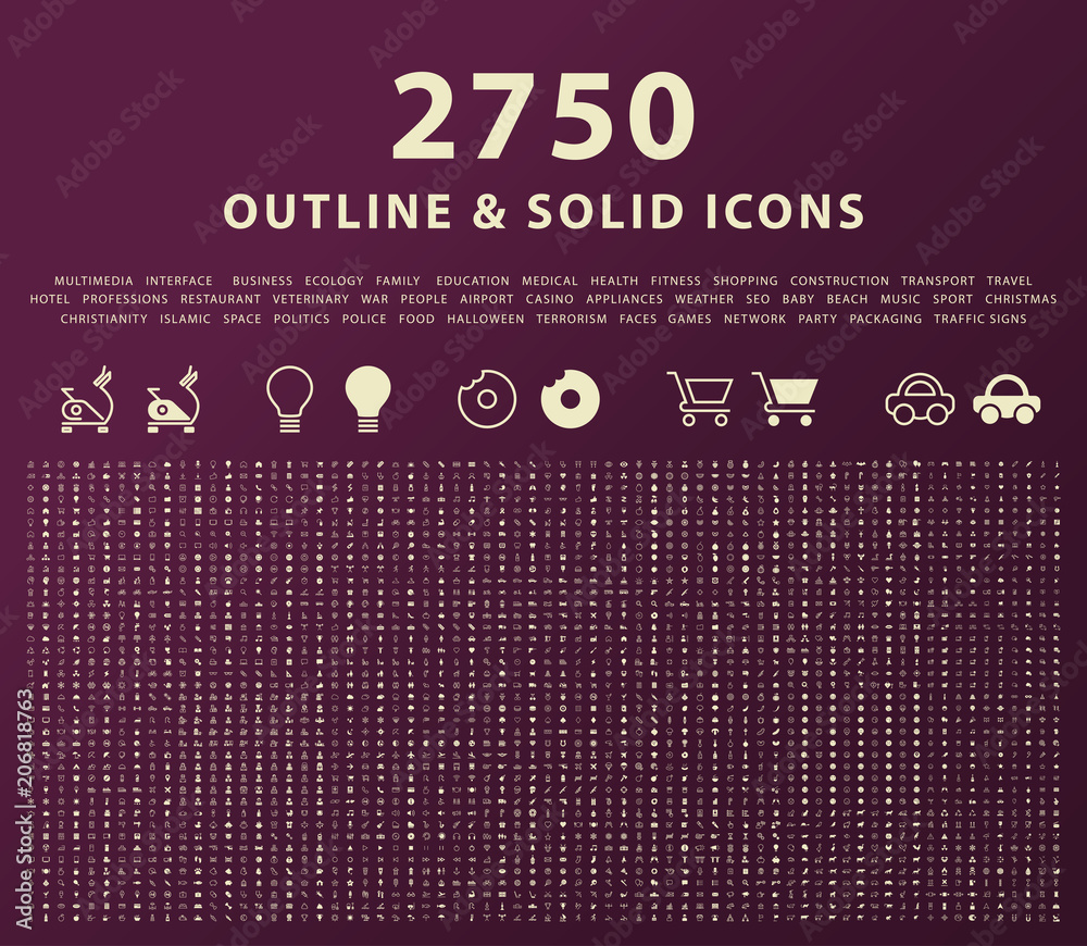The watermark will not be included on Wall mural.: Set of 2750 outline and solid icons on dark background - vector isolated elements