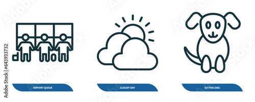 Wall mural : Set of 3 linear icons from airport terminal concept - outline icons such as airport queue, cloudy day