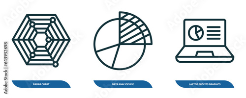 The watermark will not be included on Wall mural.: Set of 3 linear icons from business and analytics concept - outline icons such as radar chart, data a