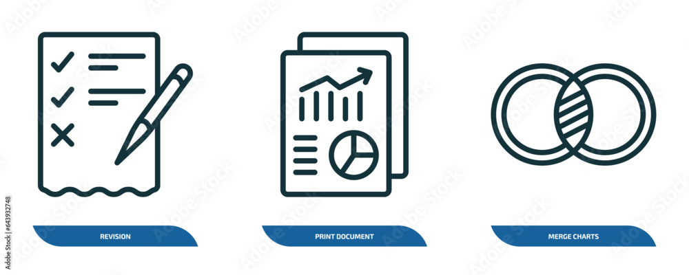 The watermark will not be included on Wall mural.: Set of 3 linear icons from business and analytics concept - outline icons such as revision, print doc
