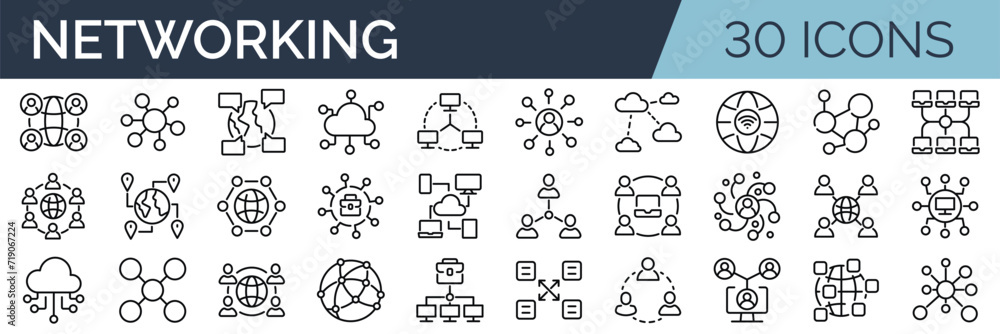 Wall mural set of 30 outline icons related to networking. linear icon collection. editable stroke. vector illus