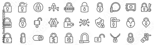 Wall mural set of 30 outline icons related to padlock. linear icon collection. editable stroke. vector illustra
