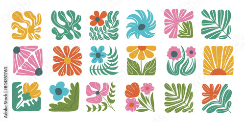 Wall mural set of abstract groovy floral botanical square shape. poster with wavy minimal flower plant in trend
