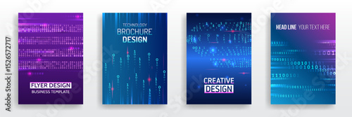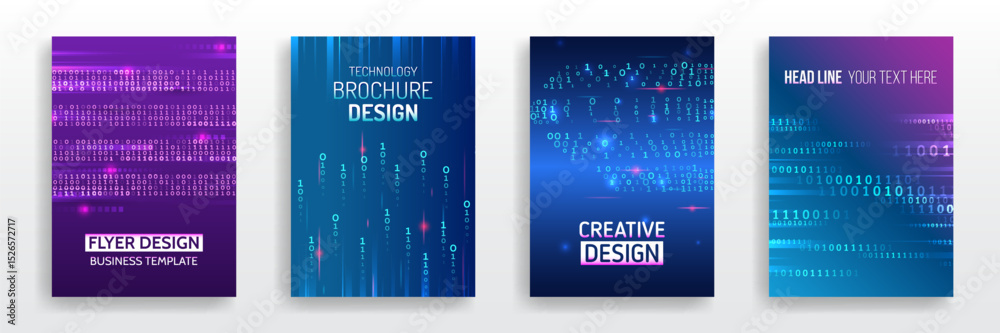 Wall mural : Set of abstract technology brochure and flyer designs with binary code, gradient backgrounds, and fu