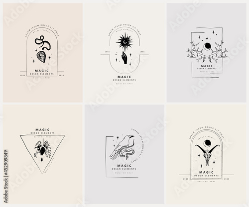 Wall mural set of boho hand drawn mystical magic set. esoteric doodle elements and logo icons with hands, raven