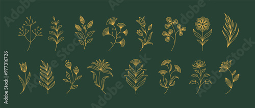 The watermark will not be included on Wall mural.: Set of boho simple geometric branch and flowers - botanic design elements in wavy and vintage style -