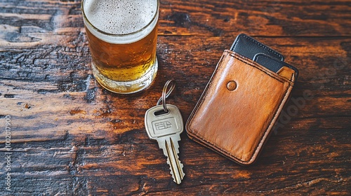 The watermark will not be included on Wall mural.: Set of car keys on a table next to a drink and a wallet highlighting the risks and consequences of d