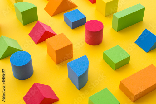Set of colorful geometric cube or block toy on yellow background - abstract pattern design compositioWall mural