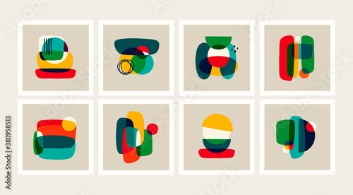 Wall mural set of eight abstract patterns. square cards. boho posters. hand drawn various shapes and doodle obj