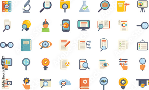 The watermark will not be included on Wall mural.: Set of flat icons representing searching and researching information using magnifying glass, books,