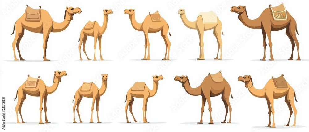 The watermark will not be included on Wall mural.: Set of flat style vector illustrations featuring various camel designs in different poses and colors