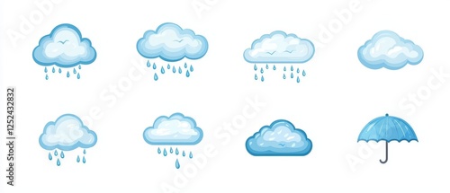 The watermark will not be included on Wall mural.: Set of flat vector illustrations featuring various cloud designs and umbrella for weather-related th