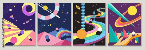 Wall mural : Set of four different bright colorful abstract designs with planets and winding road in geometric sh