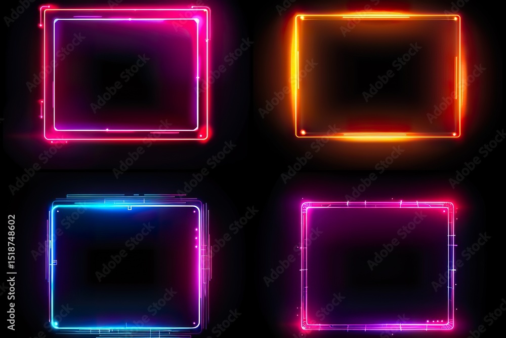The watermark will not be included on Wall mural.: Set of glowing neon square frames with gradient fills and dynamic light trails isolated on a black b