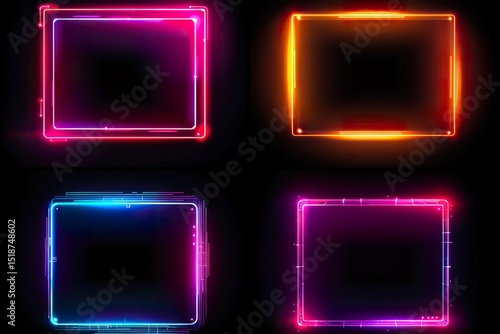 Wall mural : Set of glowing neon square frames with gradient fills and dynamic light trails isolated on a black b