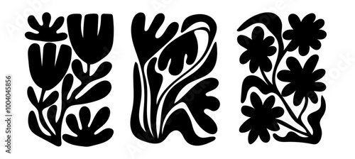 Wall mural : Set of groovy floral botanical black background in trendy naive retro hippie 60s 70s style - vertical