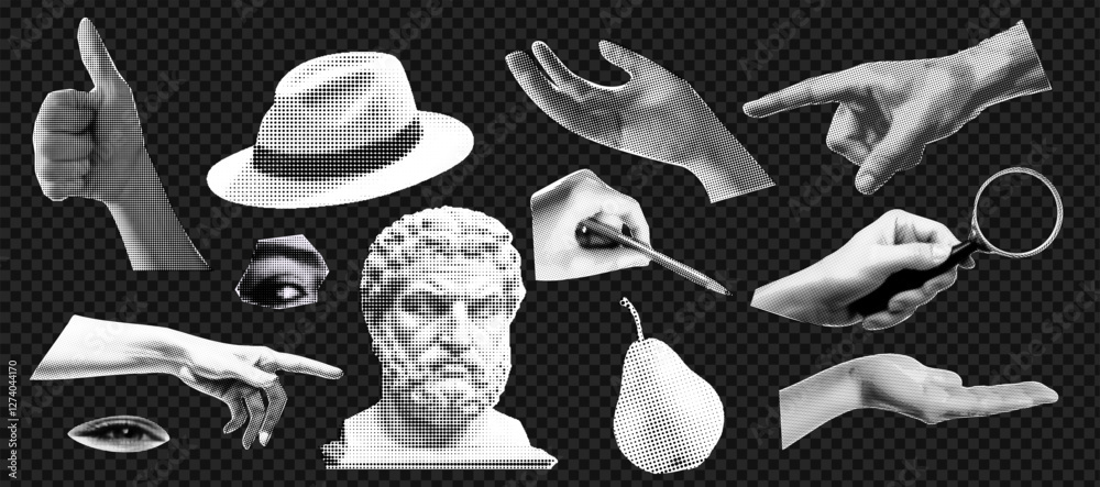 Set of hands gestures at the popart style and halftone effect on the transparent grid background - trWall mural