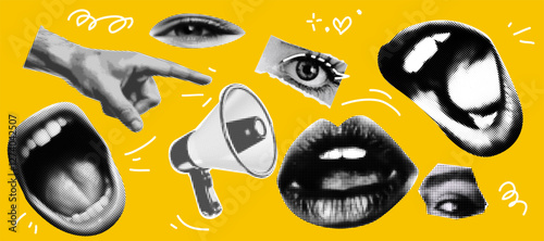 Wall mural set of hands gestures at the popart style and halftone effect on the transparent grid background. tr