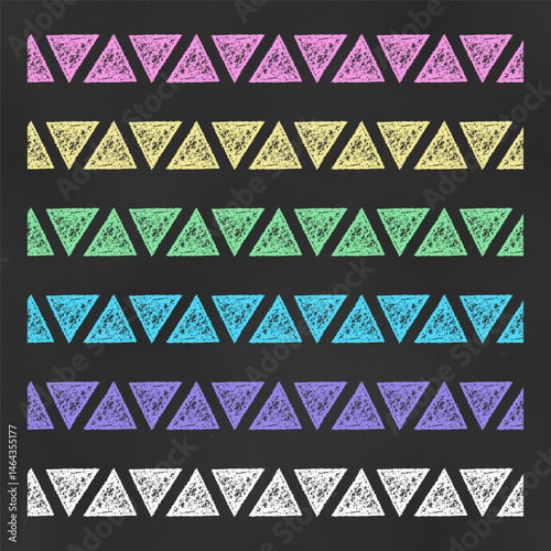 Wall mural set of horizontal seamless borders chalk drawn sketches of colorful lines of triangles.