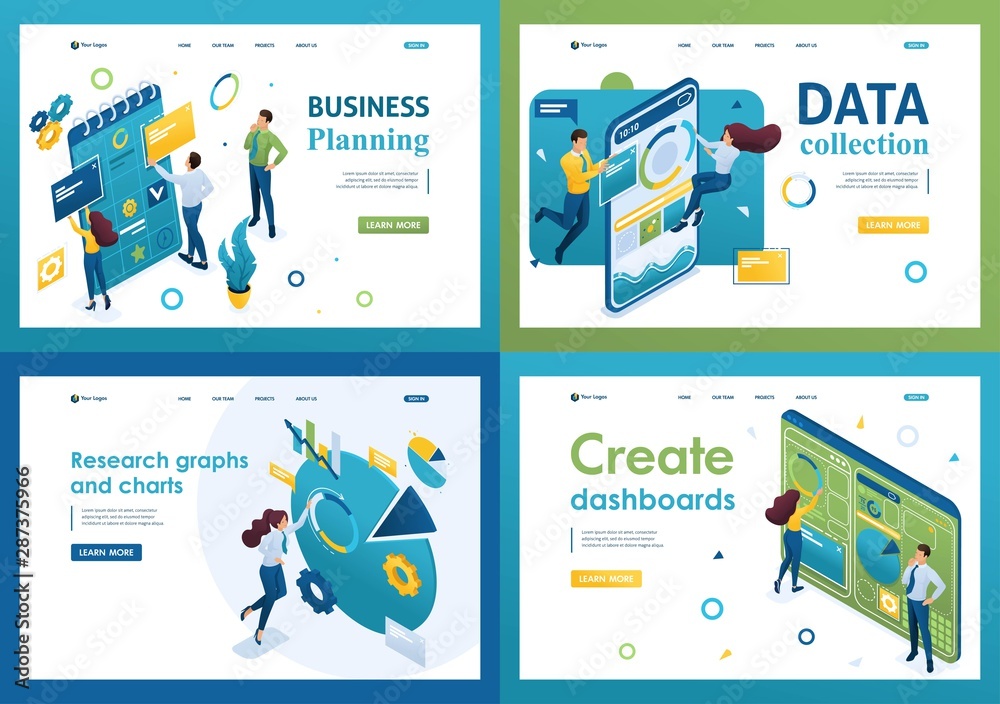 Wall mural set of isometric concepts.business planning, data collection, create dashboard. for landing page con