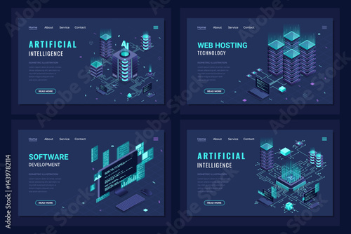 Wall mural : Set of isometric landing page template - modern technology concept for web hosting, software developm