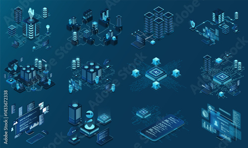 Wall mural set of isometric modern technology concept for cloud computing, datacenter, database, artificial int - Wall murals Wall mural set of isometric modern technology concept for cloud computing, datacenter, database, artificial int - Wall murals