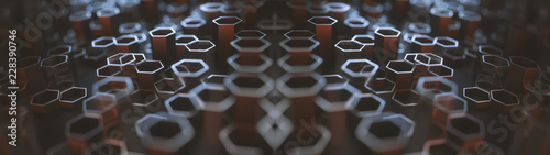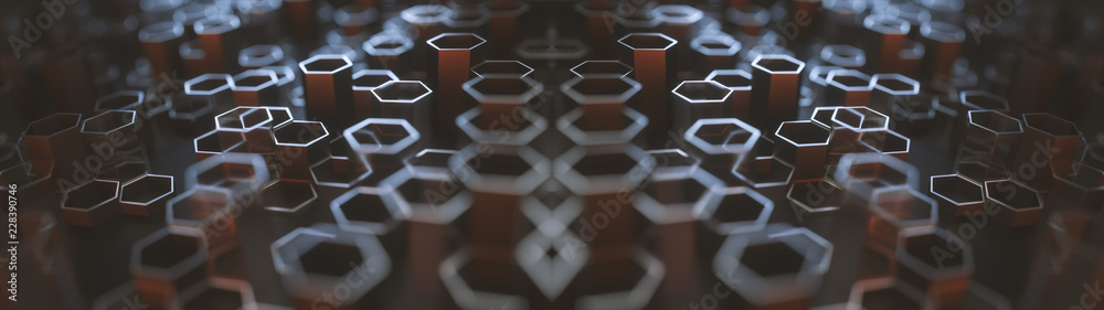 Wall mural : Set of metal and glass hexagonal columns - creative honeycomb geometric structure - tech pattern of ce