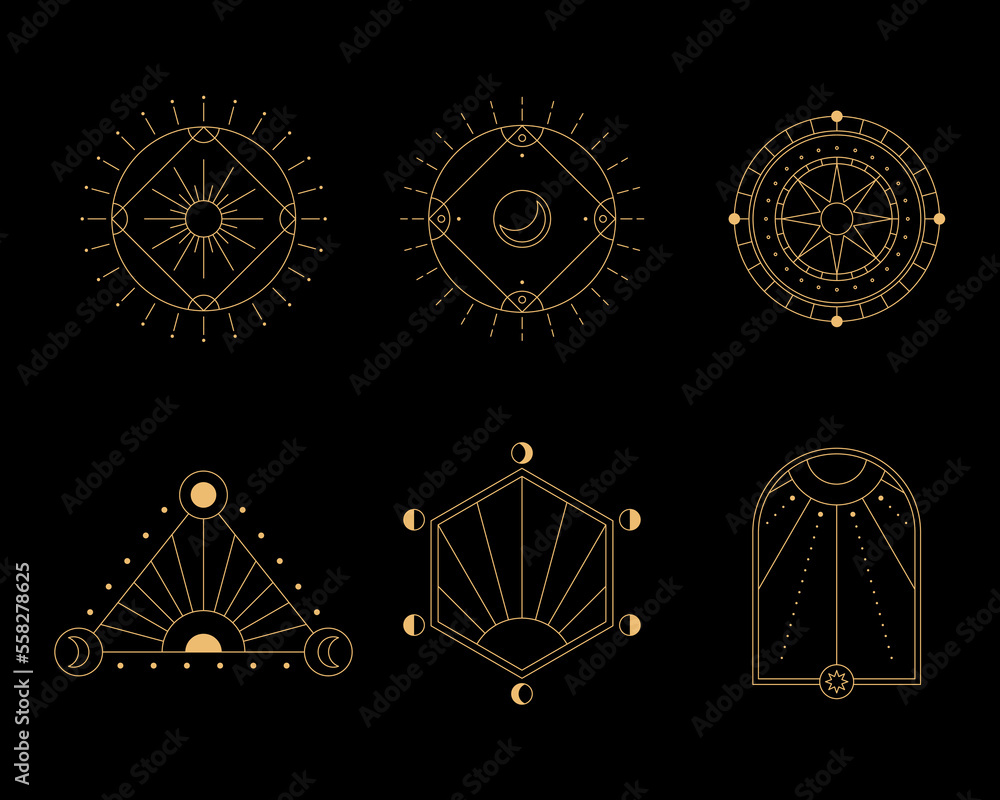 The watermark will not be included on Wall mural.: Set of moon and sun line art - minimal boho linear symbols - celestial mystic element - vector line art