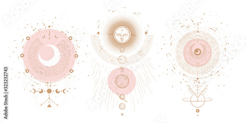 Wall mural set of mystical and mysterious illustrations in hand drawn style. minimalistic objects made in the s