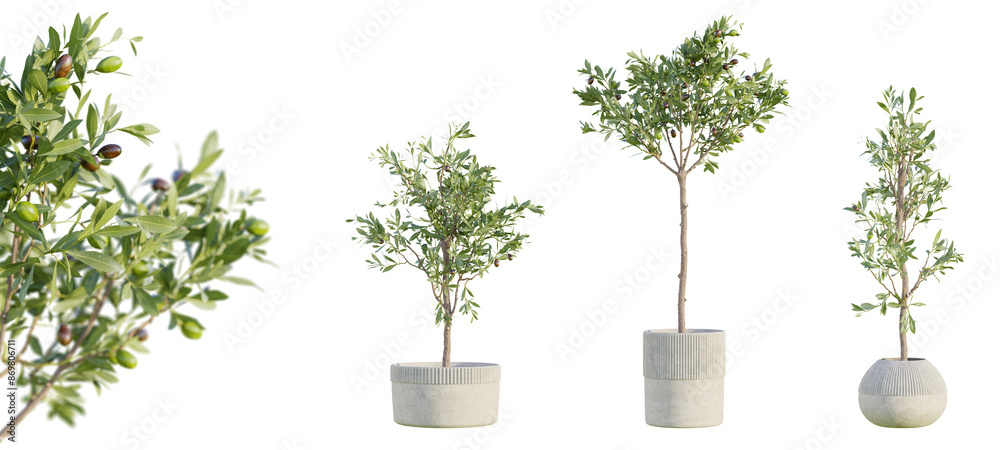 The watermark will not be included on Wall mural.: Set of olive trees in terracotta pots isolated on transparent background with selective focus close