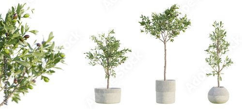 Wall mural set of olive trees in terracotta pots isolated on transparent background with selective focus close