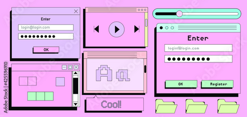 Wall mural set of retro user interface tabs and icons. screen panels and dialog boxes of computer software.