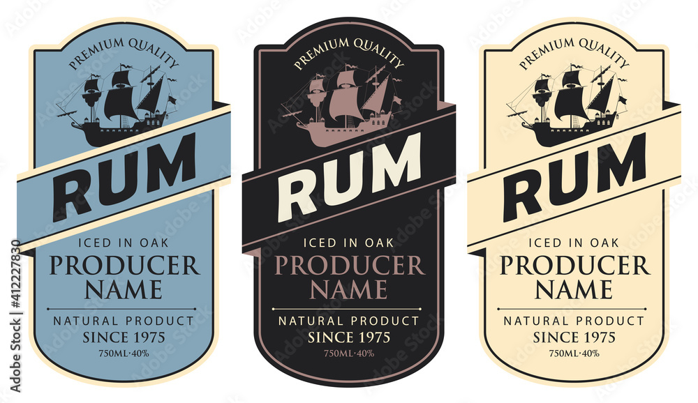 The watermark will not be included on Wall mural.: Set of three vector labels for rum in a figured frames with sailing ships and inscriptions in retro