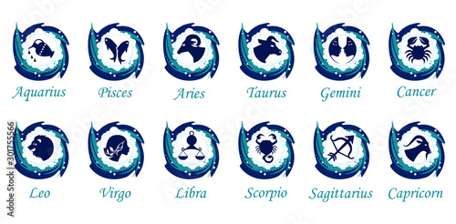 Wall mural set of twelve signs of the zodiac on the background of a snow circles. prediction of the future. vec