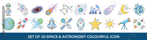 Wall mural : Set of twenty colorful space and astronomy icons featuring alien astronaut rocket spaceship and more