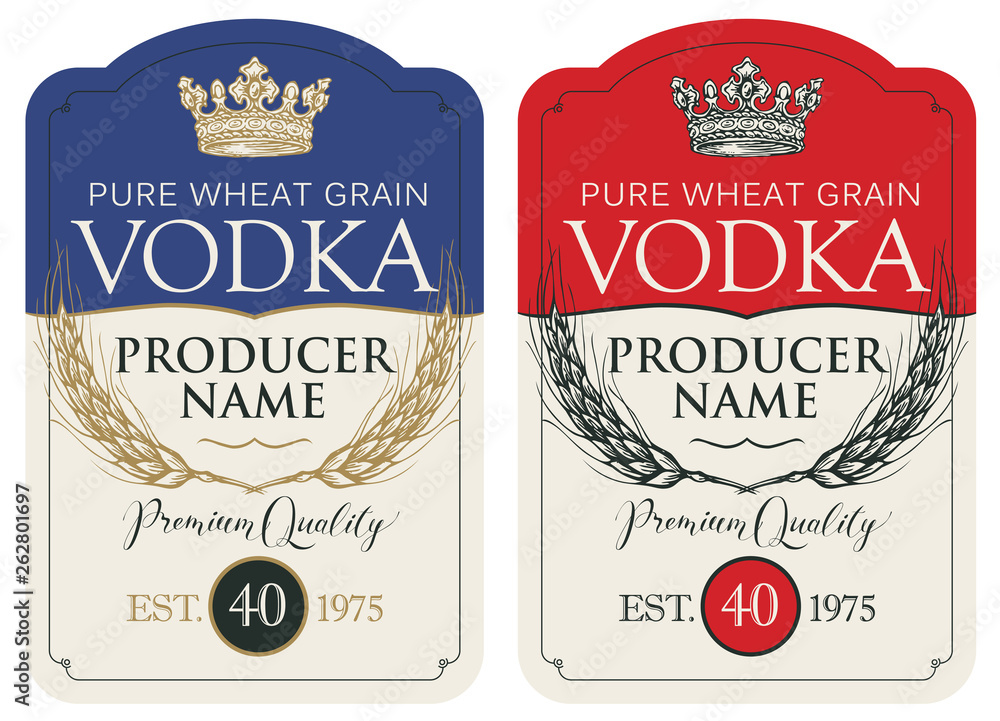 The watermark will not be included on Wall mural.: Set of two vector labels for vodka in the figured frame with crown, ears of wheat and inscriptions i