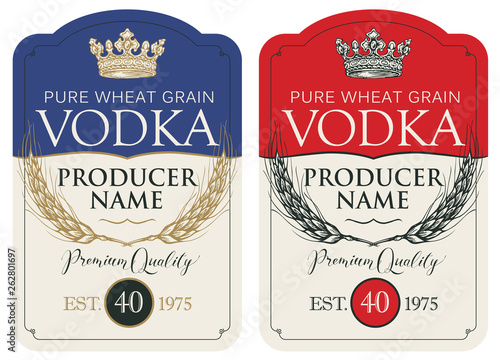 Wall mural : Set of two vector labels for vodka in the figured frame with crown, ears of wheat and inscriptions i