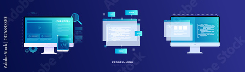 Wall mural : Set of vector illustrations on the theme of programming and software - monitors with program codes on